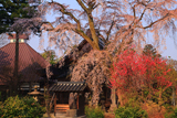 上越市寺町の日朝寺毘沙門堂前に自立しているシダレザクラ。 樹齢は200年と推定される古木で、毘沙門堂の屋根より高く、万朶の紅雲を境内に繁らせている。 城下町高田、65もの寺社が甍を連ねる寺町随一の名桜である。 日蓮宗日朝寺は、文永11年(1274年)、佐渡流罪を許された日蓮が府中(直江津)に宿泊した際、真言宗称朝寺の蒙現が日蓮に帰依して日朝と改めたことが起源という。