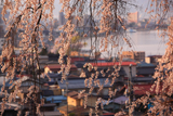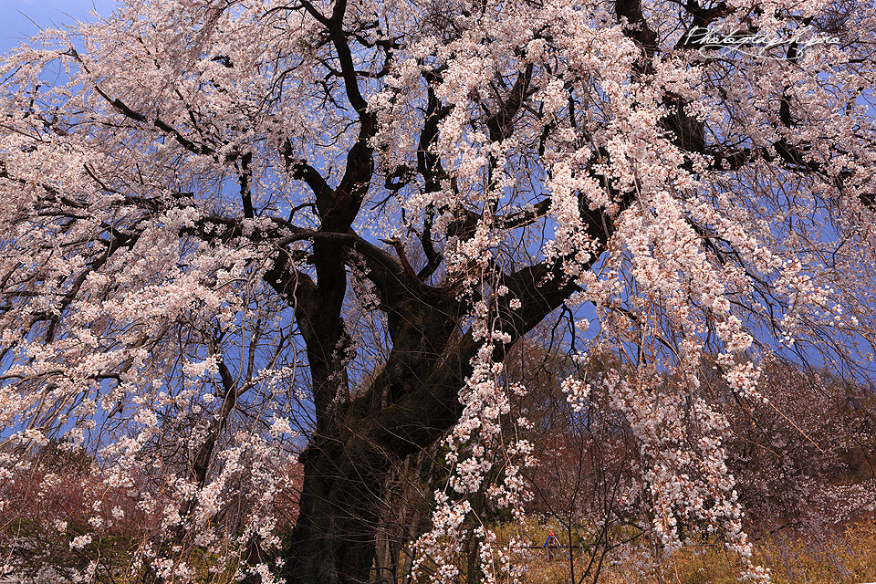 諏訪市の温泉寺のシダレザクラと同時期に植えられた都しだれ?だそうです。 温泉寺の古木と比較すると、樹勢旺盛で樹高も高い見栄えがするサクラです。 さらにロケーションも秀でており、下から見上げても、上から眺めても素晴らしいです。 ひとつ残念なのは、高圧鉄塔が目前に立っていること。 ですので、樹冠右側はカットしてあります。