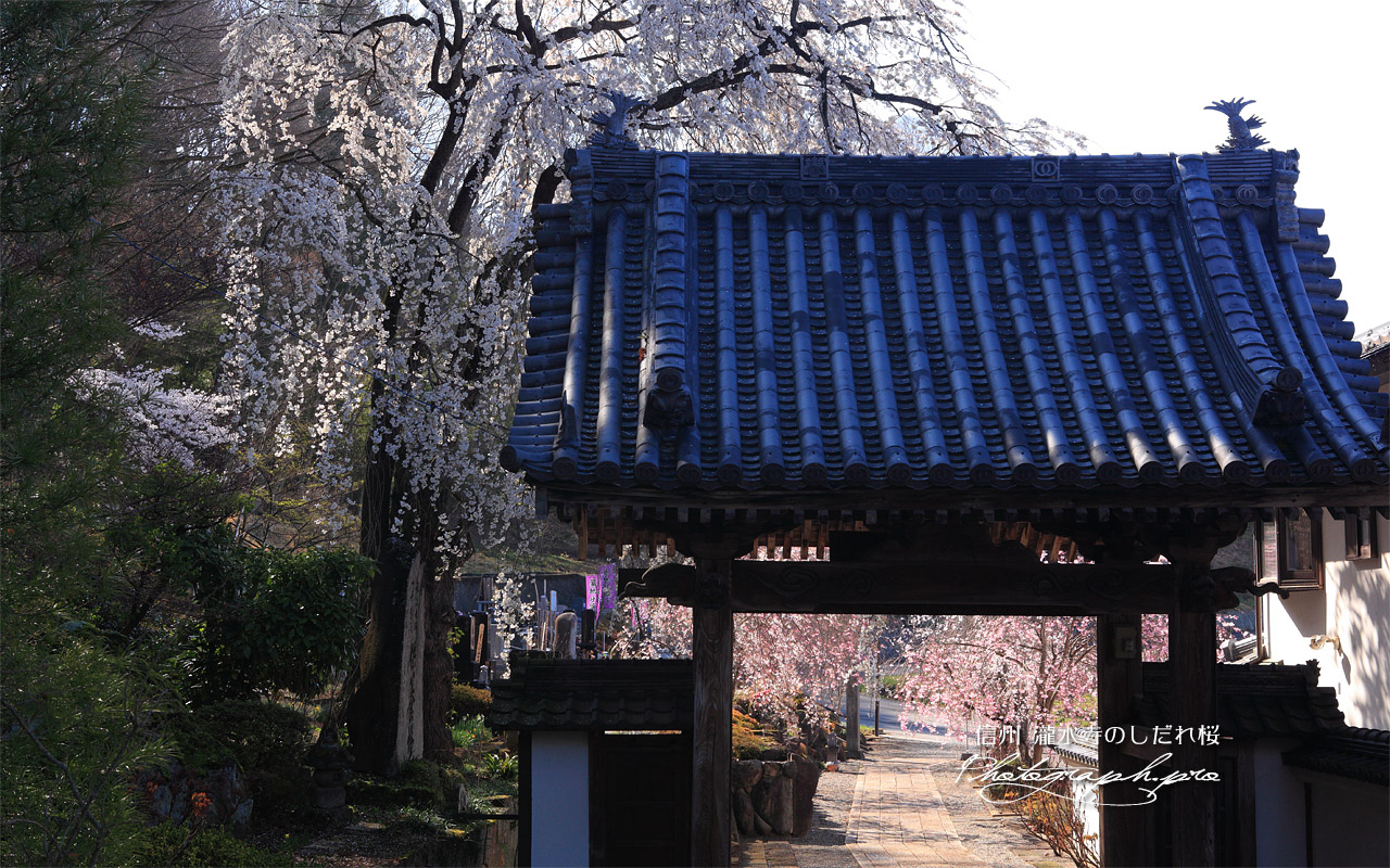 本瓦葺きの重厚な山門で、参道には紅枝垂桜も植樹されています。